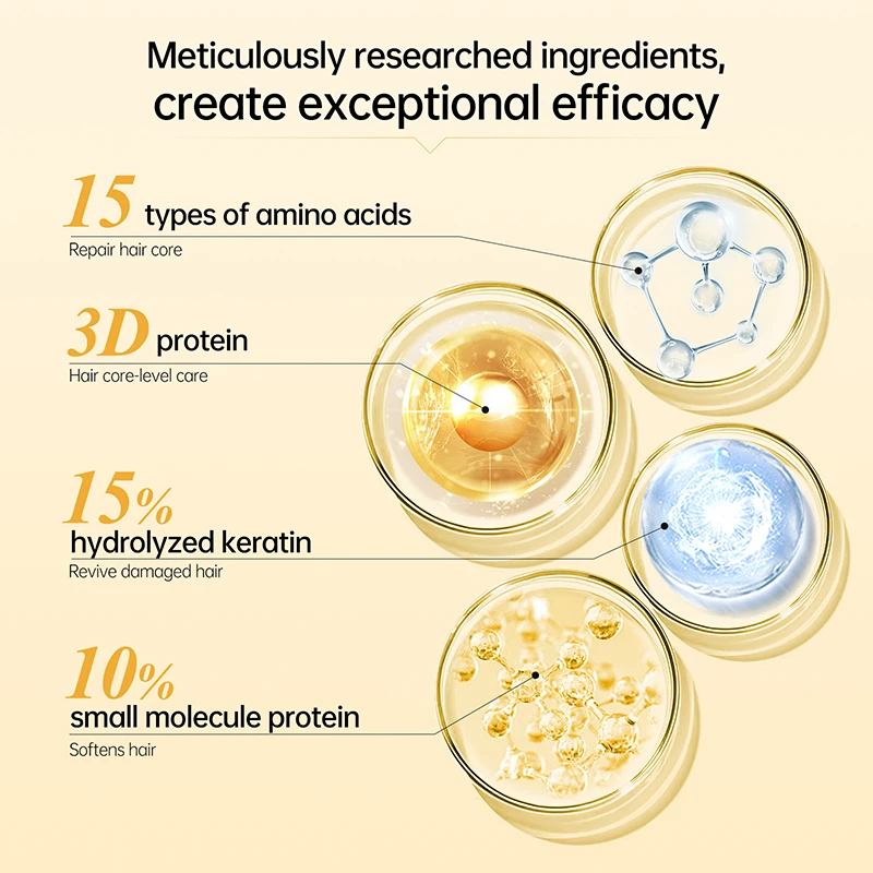 The formula specially developed for hair damaged by hot dyeing contains 15 kinds of natural amino acids to supplement hair nutrition. Formulated with 15% hydrolyzed keratin to quickly repair damaged hair. Combined with 10% small molecule protein, it deeply nourishes the hair core, repairs the hair from the inside to the outside, and immediately repairs the hair damaged by perm and dyeing, making the hair soft, smooth, moist and shiny. No frizz, continuous hair. No split ends. It improves frizzy, dry, and untang hair like dry straw.